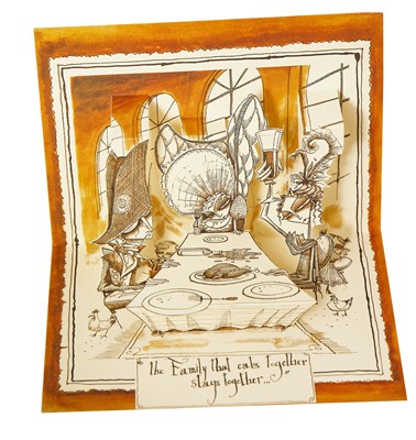 designed as a James Gillray-inspired pop-up card depicting a grotesque Regency-era family at a dining table