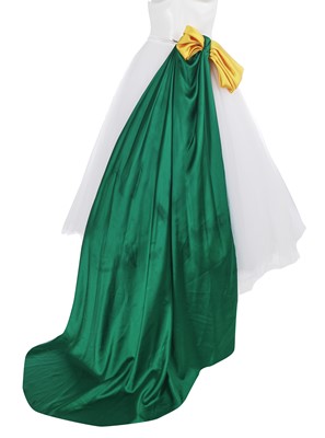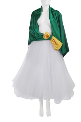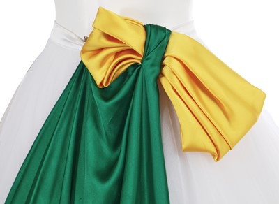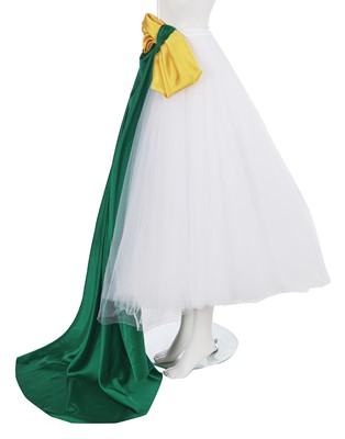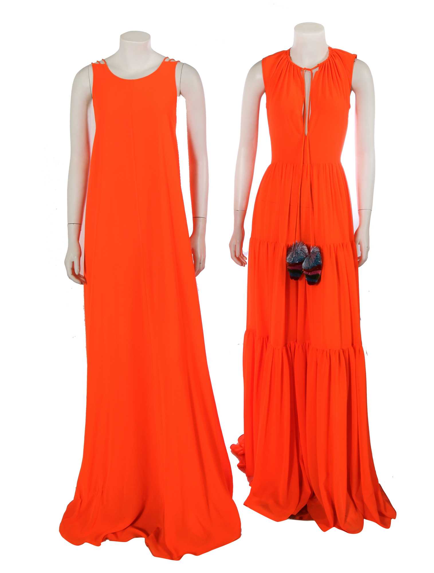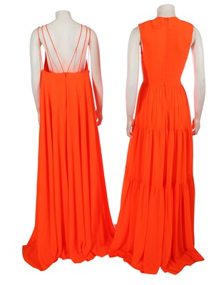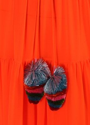 comprising: an orange crêpe dress, Autumn-Winter 2020-21, with keyhole neckline, self-ties to neck tipped with multicoloured 'raffia' pompoms, tiered ruffle skirt, labelled, bust 81cm 32in; another orange dress of matching fabric from the same collection with spaghetti straps to back, bust 102cm 40in; a layered white tulle skirt, Spring-Summer 2022, with yellow and green satin bow and train to waist, waist 56cm 22in (2)