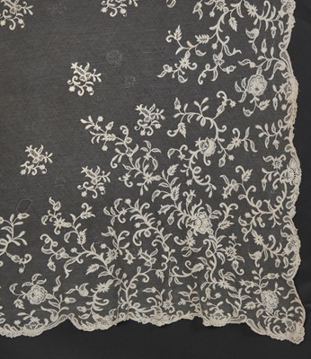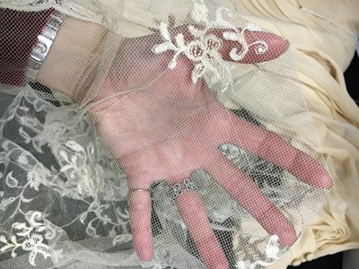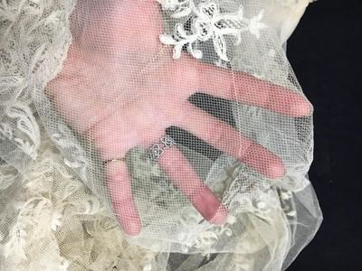 labelled, the Edwardian-style high-necked gown with a pleated bodice, skirt and full sleeves, with a detachable matching belt centred with a bow, bust 92cm, 36in; together with an ivory lace veil, 210cm, 83in square (3)