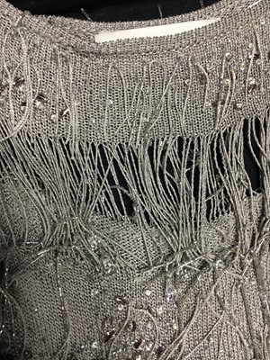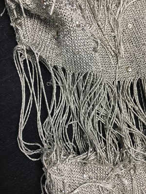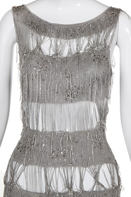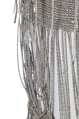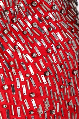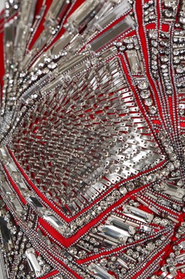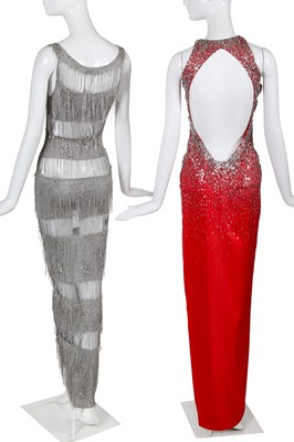 labelled, the first of red satin decorated with a burst of large cut glass stones, rhinestones and metallic paillettes radiating from the chest, long kick split to side, open back, bust 86cm 34in; the second of banded silver wool jersey decorated with rhinestones, the fringing of wool and silver bugle beads, 81cm 32in (2)
