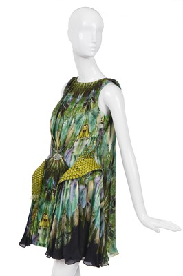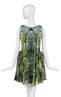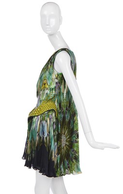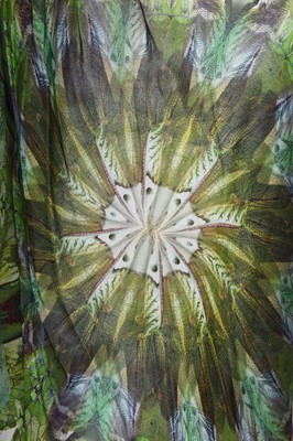 labelled, size 40, the kaleidoscope print in shades of green, internal pannier struts which support hip bands applied with graduated chartreuse enamel plaques, draped and floating panels to rear, with original retail tag attached containing spare plaques, bust approx 82cm, 32in
