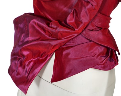 gold on ivory couture label, the boned corset draped with blue and red shot-silk faille, with asymmetric straps and hem, zip to centre back, bust 82cm, 32in