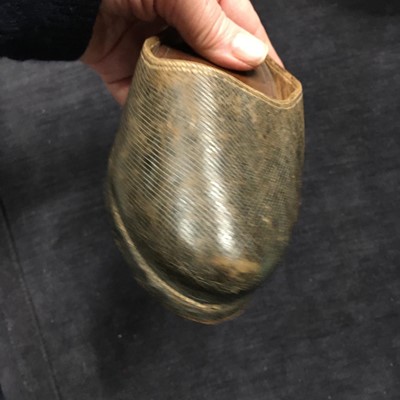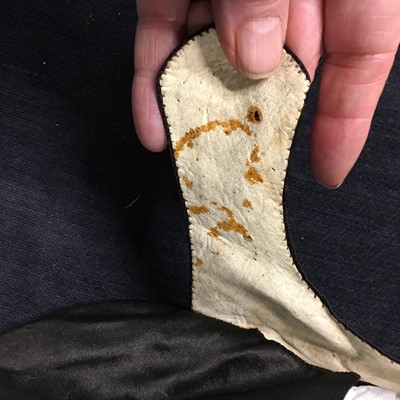A pair of black satin shoes and a pair of unusual brown leather pattens, 1770-1780
