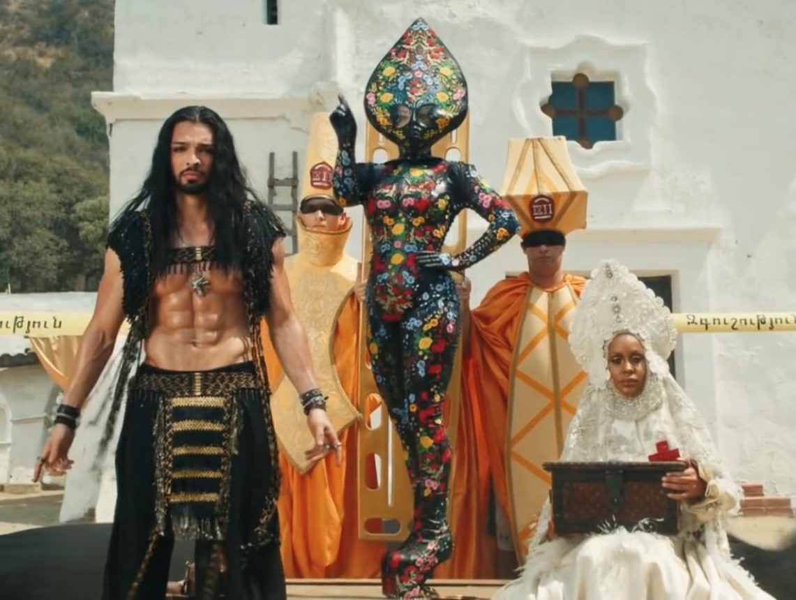 Karina Akopyan is a Russian born multi-disciplinary artist of Armenian descent, based in the UK. With an aesthetic rooted in fetishism and the decorative style of Russian folk art, her work depicts a world of pain, euphoria, frustration, invented memories and sexual fantasies, often intertwined with political references to her native homelands. She is usually the one wearing her own creations. However, when she was contacted by Lady Gaga’s design team and asked to loan her work for the video, she did not hesitate in saying 'yes',